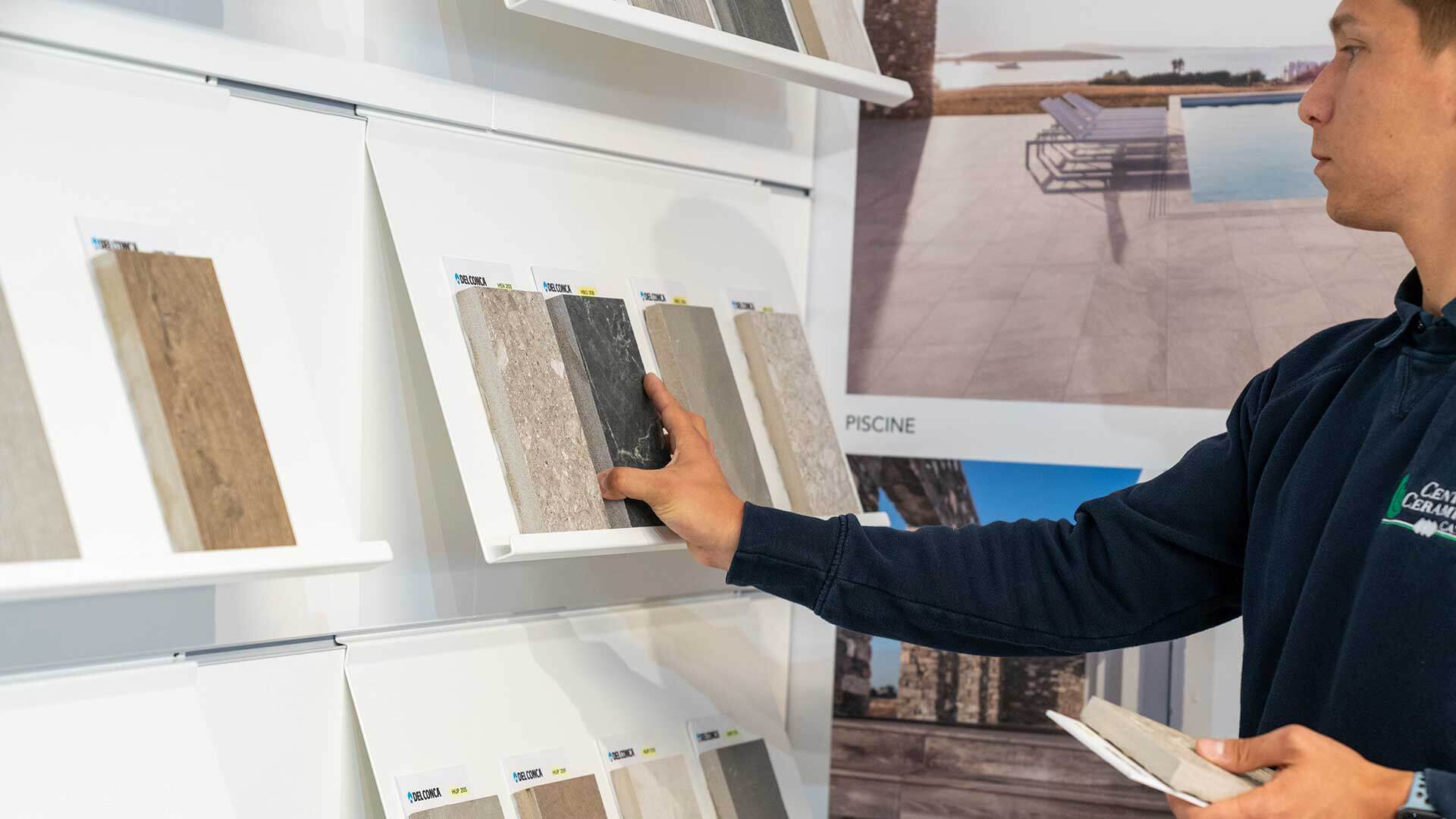 Nella sala-mostra di circa 800 mq., dislocata su 2 piani, è possibile trovare una vasta gamma di piastrelle nelle varie tipologie, pavimenti in legno, arredo bagno, sanitari, complementi e zona riscaldamento.